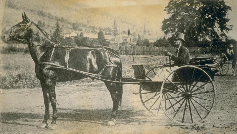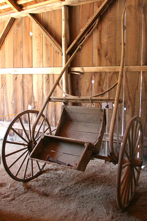 Training or Road Cart - 1800’s onward. Used for fast easy transportation of a single passenger and small loads. Also used to train horses for wagon pulling. This wagon belonged to Joseph Wood, a teamster from the nearby town of Oregon House, and was donated to California State Parks in 1965 by his daughter upon his death. |