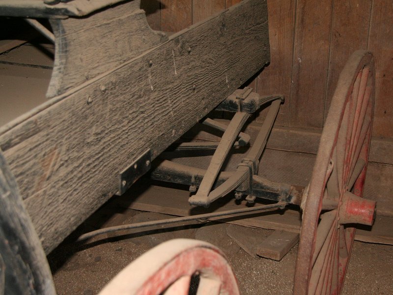 This wagon has four leaf springs: front, rear and one on either side tied to the rear axle. These fairly light springs, plus a horse-hair stuffed leather cushion (missing), made for a comfortable ride. Observe that, unlike the utility wagons (delivery, farm, freight), there are no brakes. The horse provided the force to stop as well as go.