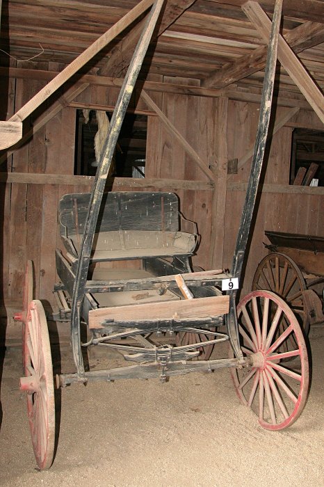 9. Democrat Carriage or Buggy - 1870s onward. A very simple buggy which served as personal transportation. It was not affordable for many families before the 1890s but was popular with professional people for quick trips between towns. Small loads or luggage could be carried in the bed. Because it has no top or cover, in cold weather the driver and passengers used heavy lap robes and sometimes a metal foot warmer, filled with fire coals. This wagon belonged to Joseph Wood, a teamster from the nearby town of Oregon House, and was donated to California State Parks by his daughter upon his death in 1965.