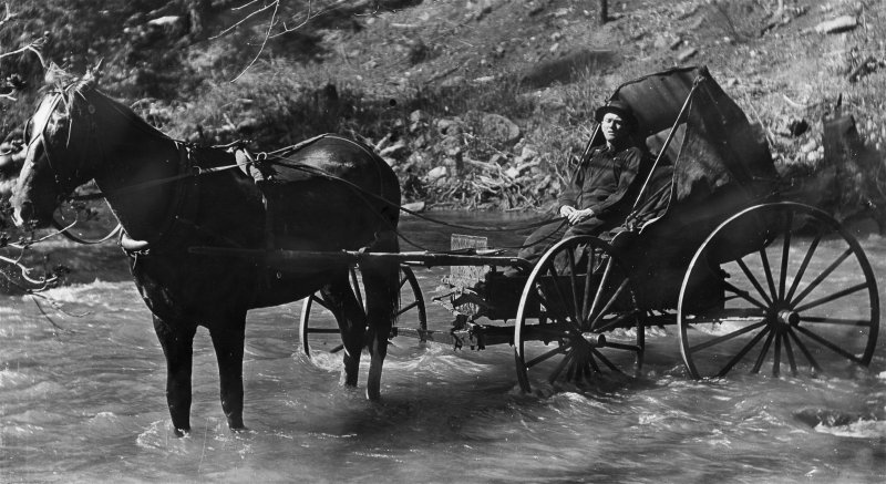 A democrat buggy in service. Those large wheels come in handy for crossing rivers.
