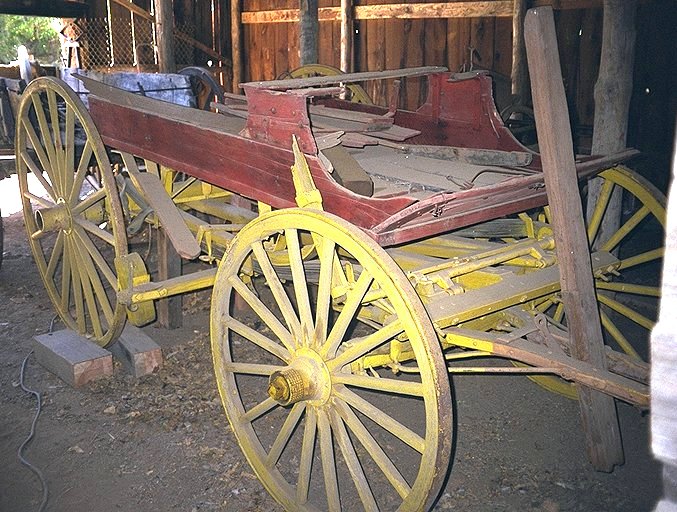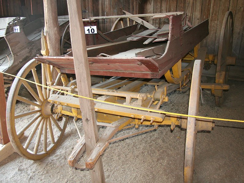 10. Stage or Concord Mountain Wagon - date uncertain, popular 1850’s - 1880’s. Used as a stagecoach on the Bidwell to Burney run. Note the multi-layered leather straps strung from front to rear under the bed, which served as springs, called thoroughbraces. They were designed to ease the strain on the horses, not passengers, by easing carriage motion during starts and stops. Like modern SUVs, a second seat could be added or removed as needed. |