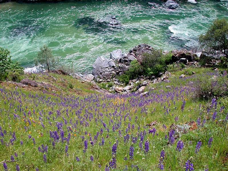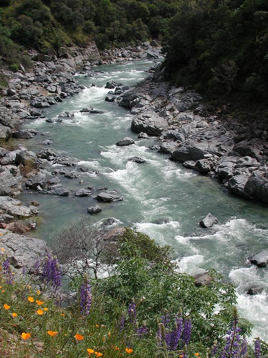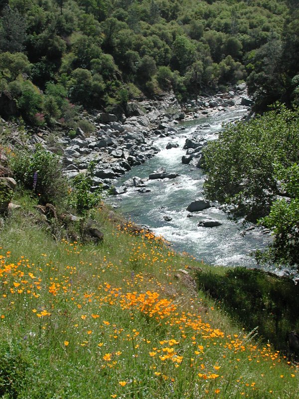 Herb LindbergThis trail starts across the river from the Visitors Center just on the opposite side of the modern Pleasant Valley Road bridge and winds up river about 1.2 miles. You return down the same trail when you come to the end of this parcel of public property. Parking is available along the road and in a lot at the trailhead. The trail follows the route of the old 1877 Caleb Cooley water ditch, so is mildly sloped and has been made wide enough for wheelchair accessibility. An upper trail from the parking lot with no severe climbs has been added recently by constructing two new bridges across river tributaries. The upper and old trails come back together about 0.2 mile from the parking lot. Buttermilk Bend trail offers spectacular views of the river and is a showcase of color during Spring wildflower season.