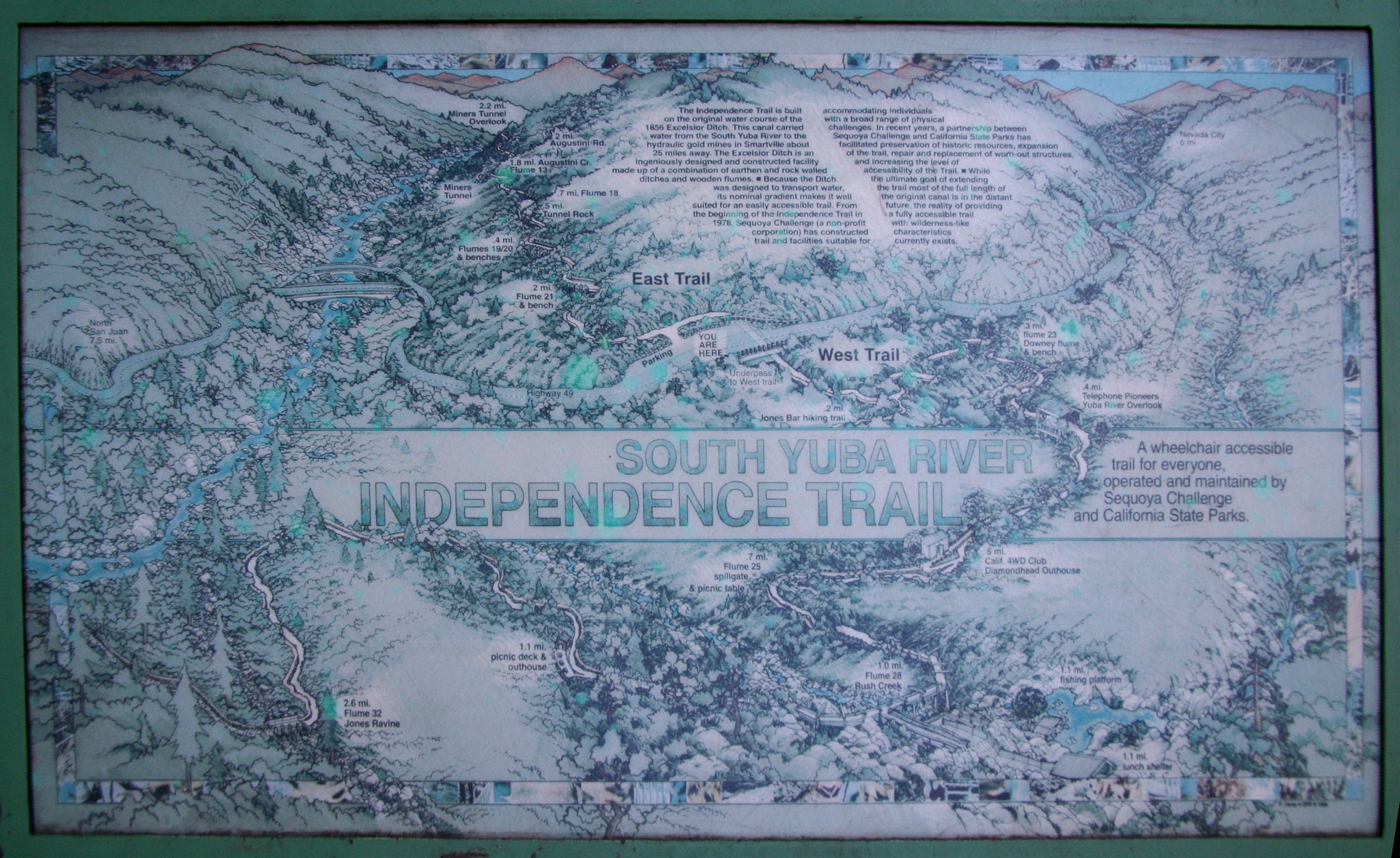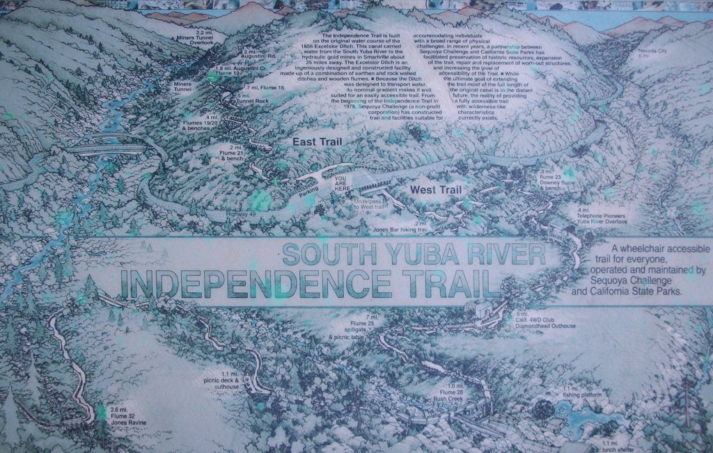 This is an easy wheelchair accessible trail that goes both upriver and downriver from a trailhead on Route 49 just downriver from 49er Crossing. Other somewhat more difficult trails sprout from the five miles of wheelchair accessible trail. Like many SYRSP trails, Independence Trail is built on an old hydraulic mining ditch, this one the 1856 Excelsior Ditch, which is why the slope is gentle enough for wheelchair access. The photograph below is of a three foot wide weather-resistant map posted at the trailhead. Click on the picture to open a larger version in a new tab, and click on that picture to expand it to full size.