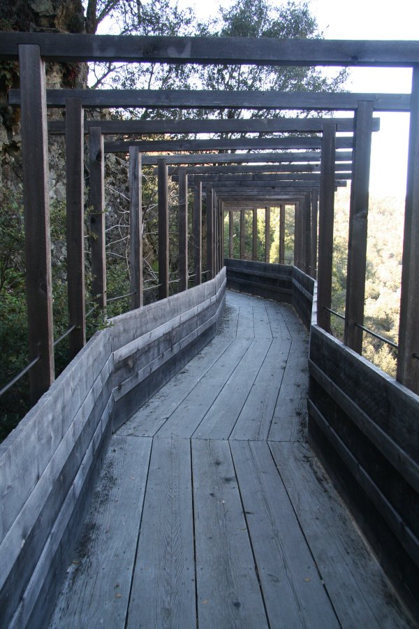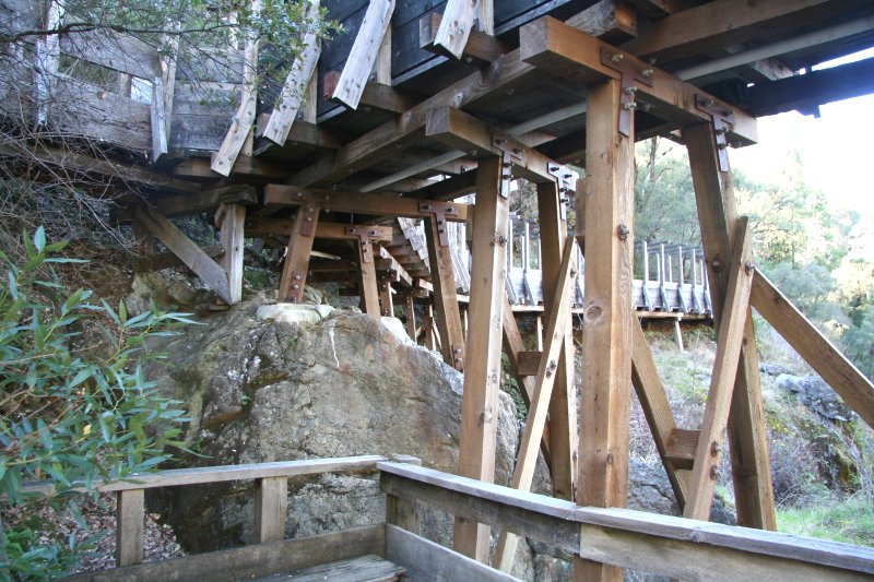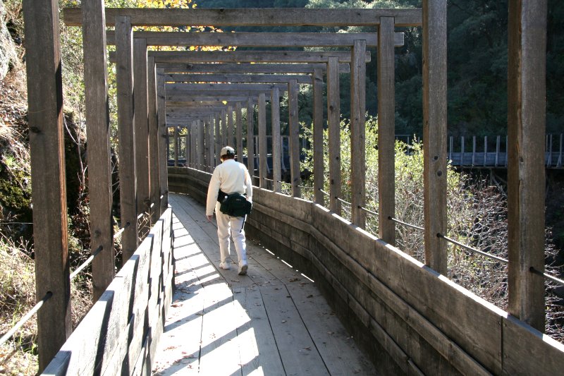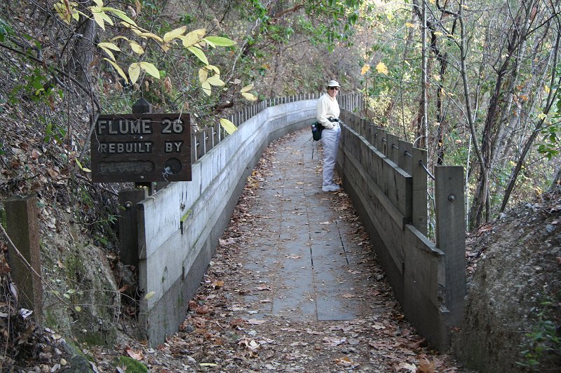The trail crosses Rush Creek on a massive flume bridge high above the creek. |