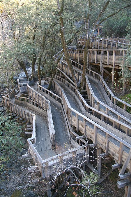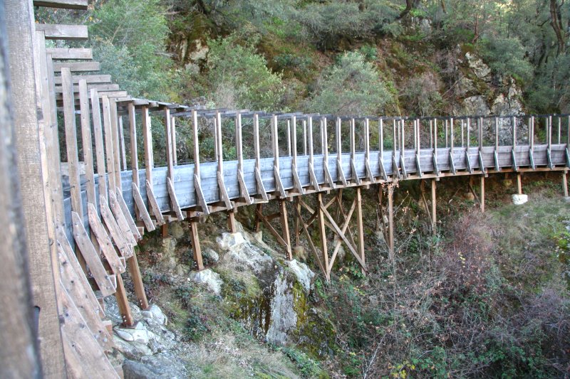 Refurbished water flumes dot the trail, interspersed by more typical woodsy trail. |